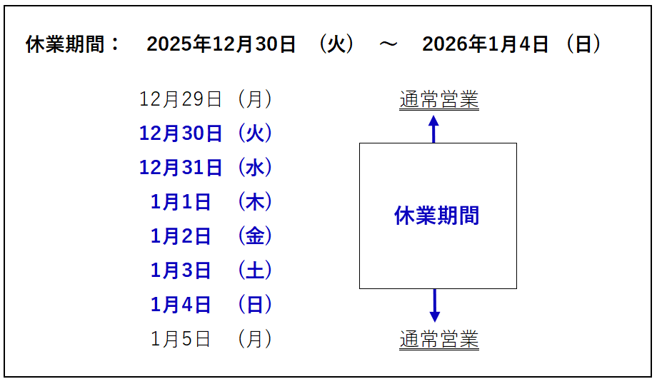 当グループでは、誠に勝手ながら下記期間を年末年始休業とさせていただきます。